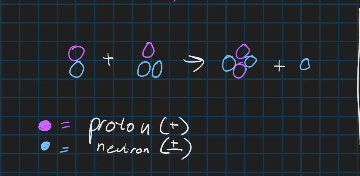 Kernfusie zoals het in de naam zegt het fuseren van 2 kernen. Het is veel moeilijker dan het klinkt. Hieronder zie je Deuterium en Tritium smelten samen om in een helium en een neutron. Bij deze fusie komt enorm veel energie vrij.