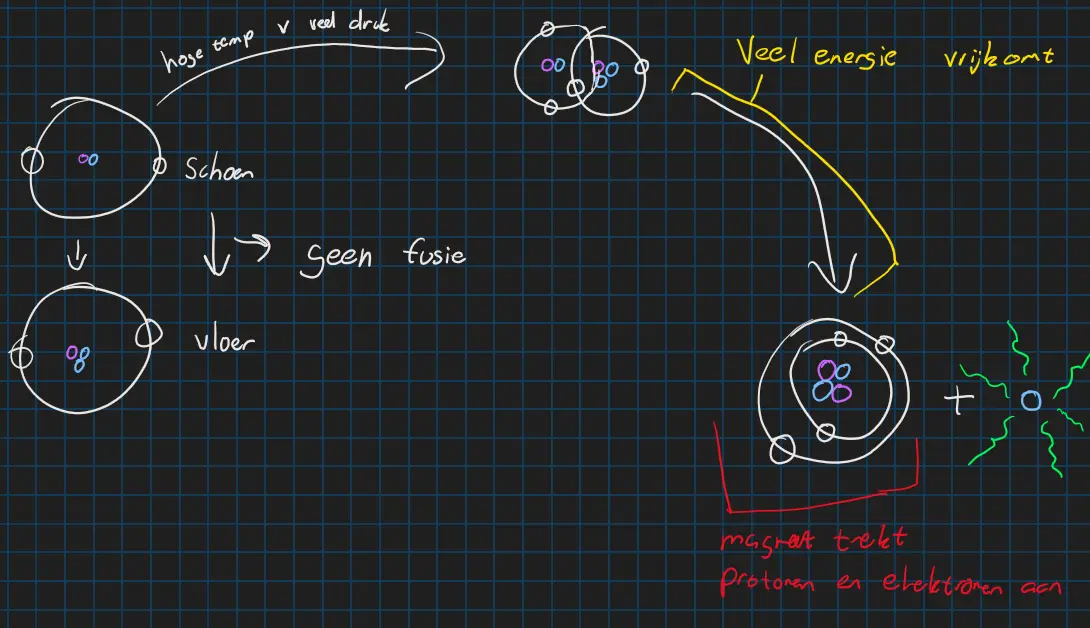 Een kern fuseert niet zo maar, dit is heel simpel te bewijzen: als je met je schoen op een vloer staat fuseren ze niet aan elkaar. Daar moet of echt heel veel, extreem veel kracht op zitten dat ze nergens meer naar toe kan. Of de tempratuur moet zo hoog zijn dat ze elkaar niet meer kunnen ontwijken. Dit wordt gedaan door een gas nog verder opwarmen dat de atoom zijn elektron verliest. Dit noem je een plasma.