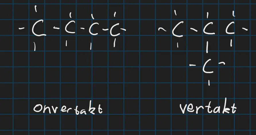 Koolwaterstoffen kunnen onvertakt zijn dan gaan ze in een rechte lijn en buigen ze niet af. Of ze zijn onvertakt dan zijn er allemaal vertakkingen in het molecuul.